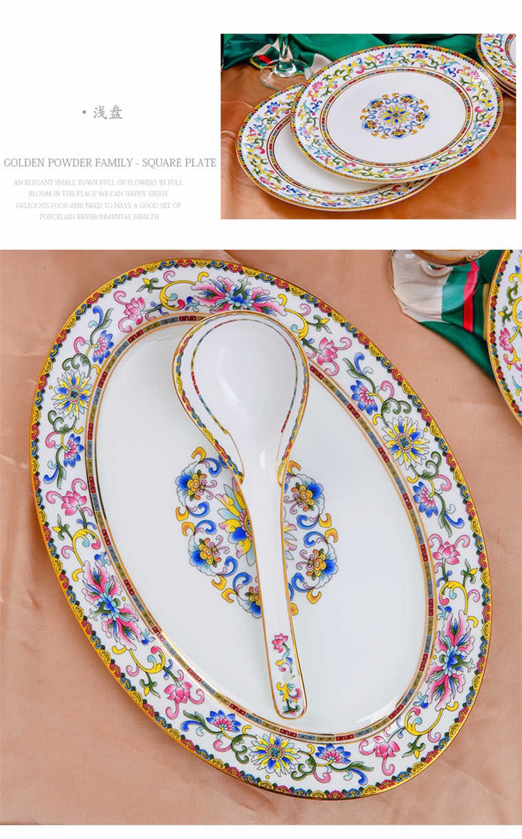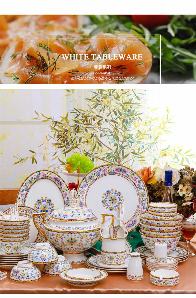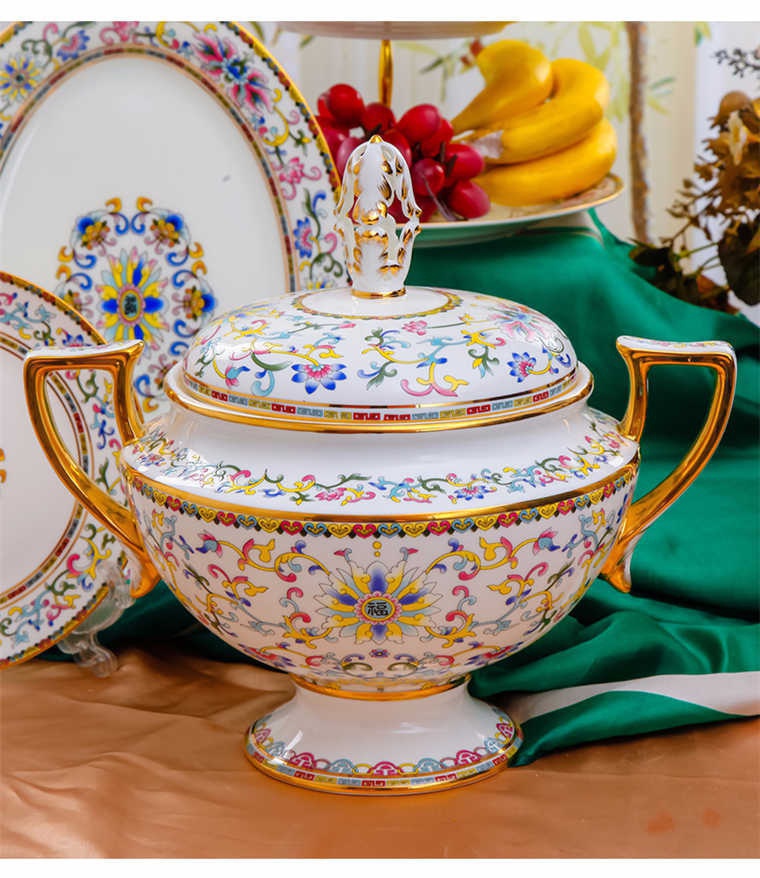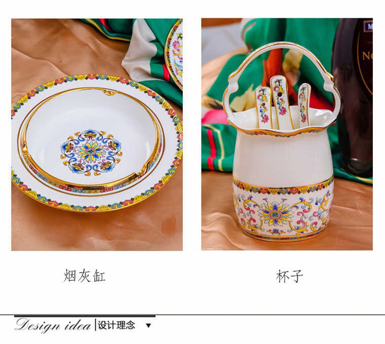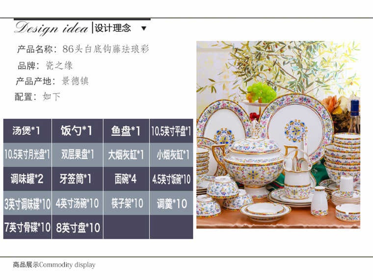 86頭白底鉤藤琺瑯彩,一個湯煲,一個飯勺,一個魚盤,一個10.5寸平盤,一個10.5寸月光盤,雙層果盤一個,一個大煙缸,一個小煙缸,二個調(diào)料罐,一個牙簽筒,四個面碗,十個4.5寸飯碗,十個三寸調(diào)味碟,十個4寸湯碗,十個調(diào)羹,十個7寸骨碟,十個8寸盤,十個筷子架。