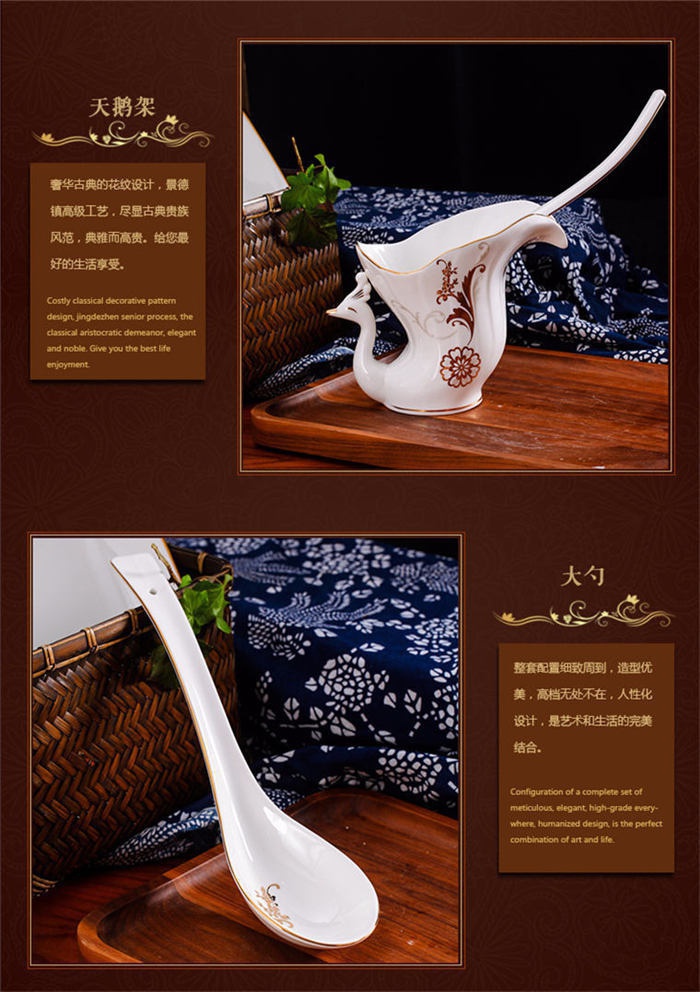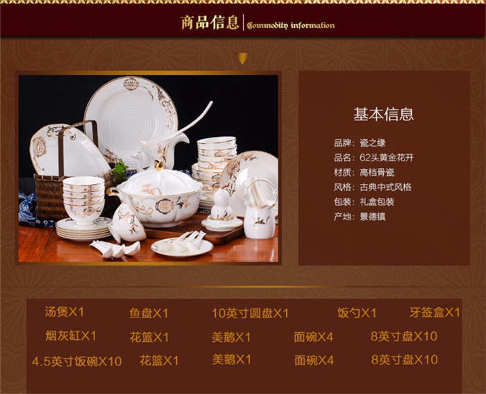 62頭黃金花開,一個(gè)湯煲,一個(gè)魚盤,一個(gè)十寸圓盤,一個(gè)飯勺,一個(gè)牙簽筒,一個(gè)煙灰缸,一個(gè)花籃,一個(gè)美鵝,四個(gè)面碗,十個(gè)八寸盤,十個(gè)4.5寸飯碗,十個(gè)五寸骨碟,十個(gè)調(diào)羹,十個(gè)筷子架。