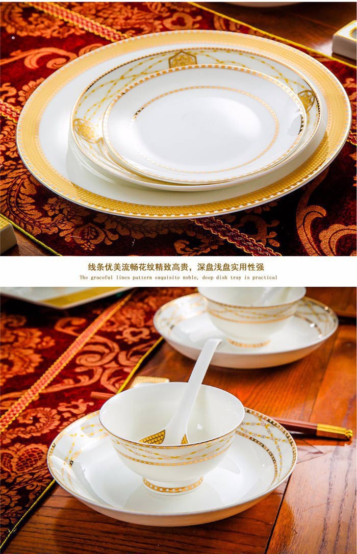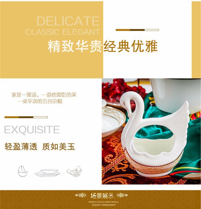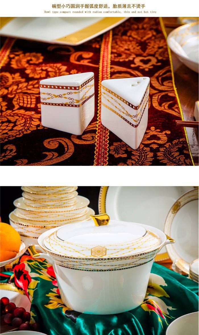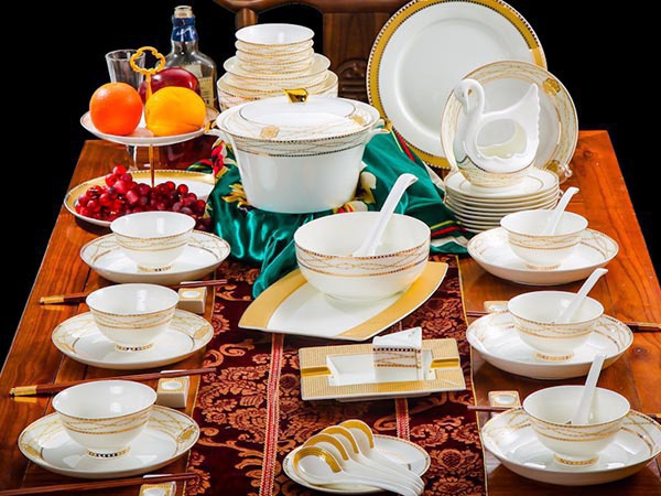 64頭金色港灣,一個湯煲,一個魚盤,一個十寸圓盤,一個飯勺,一個煙灰缸,兩個胡椒瓶,四個面碗,一個雙層水果盤,一個美鵝,十個4.5寸飯碗,十個五寸骨碟,十個八寸盤,十個調(diào)羹,十個筷子架。