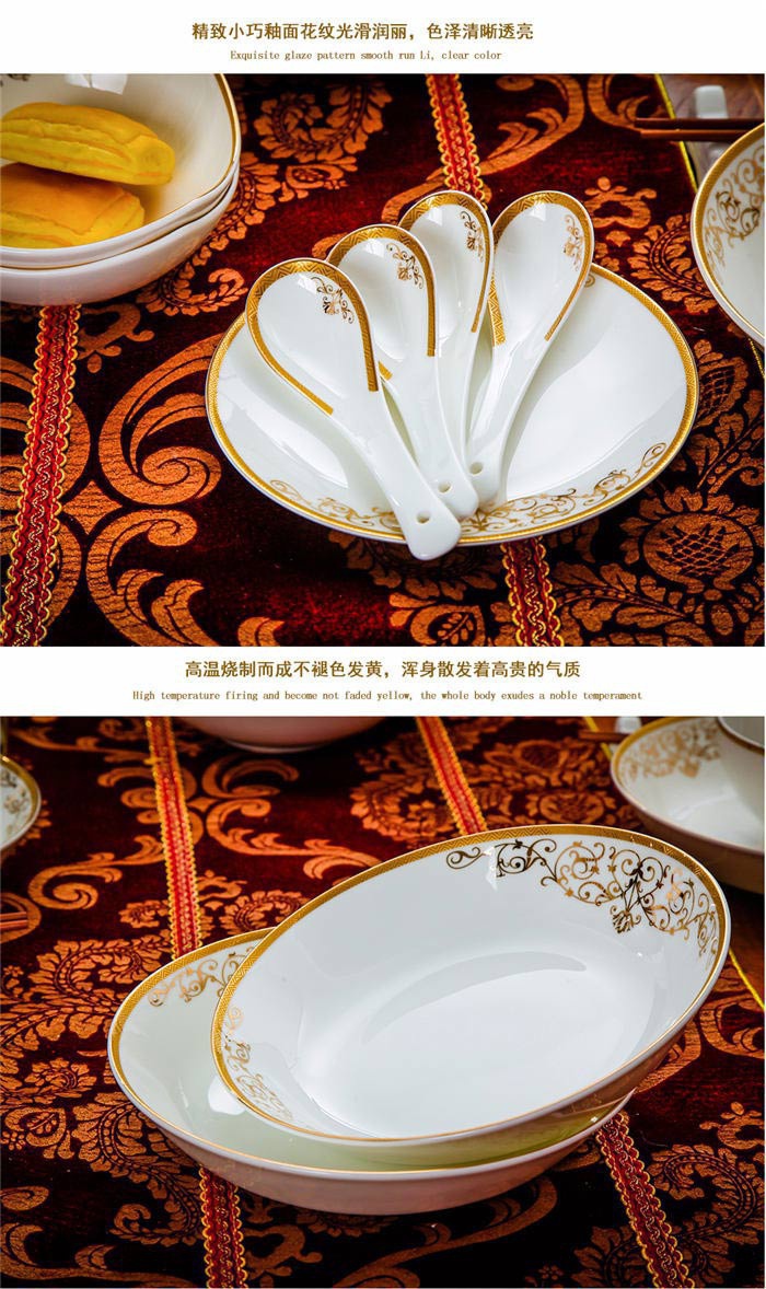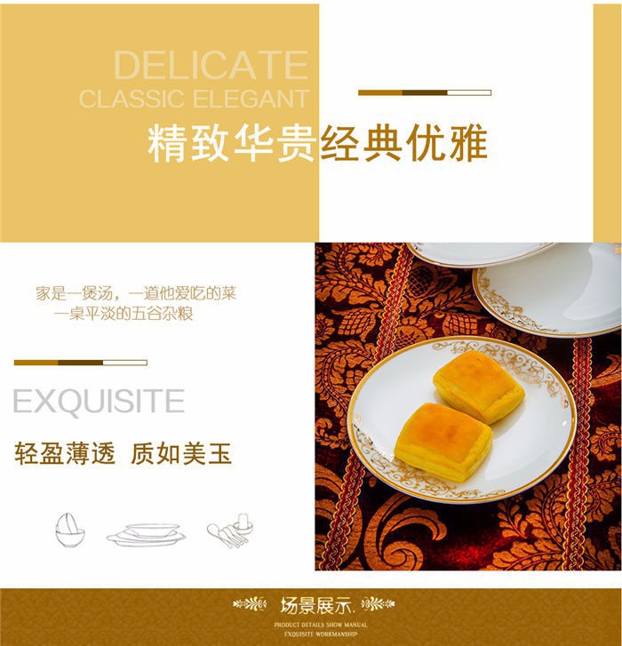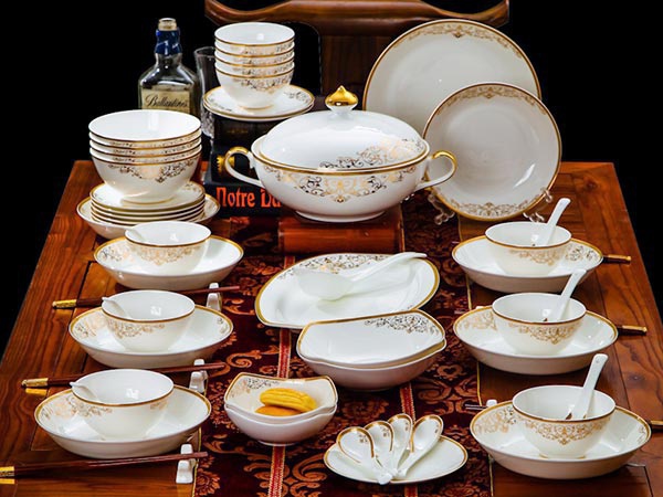 60頭相思,一個湯煲,一個魚盤,一個10寸大圓盤,一個飯勺,兩個沙拉碟,四個面碗,十個4.5寸飯碗,十個5寸骨碟,八個8寸圓盤,兩個8寸方盤,十個調(diào)羹,十個筷子架。