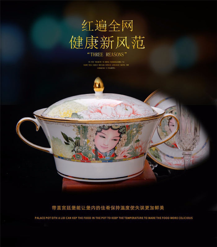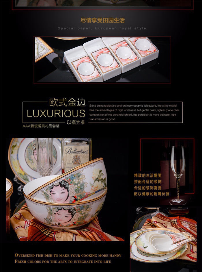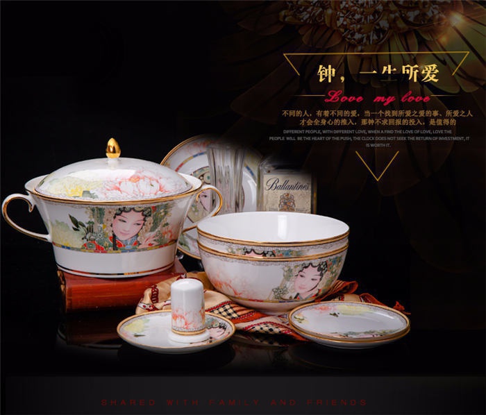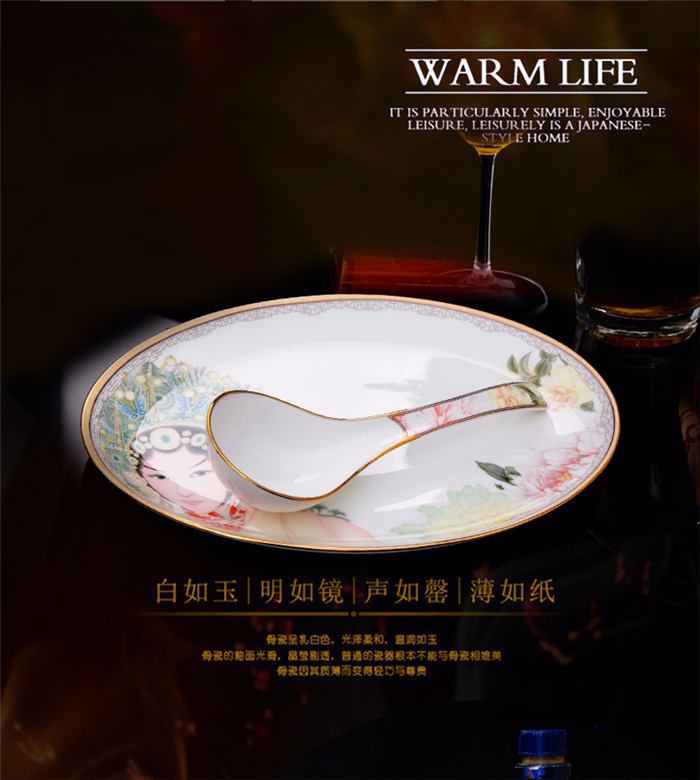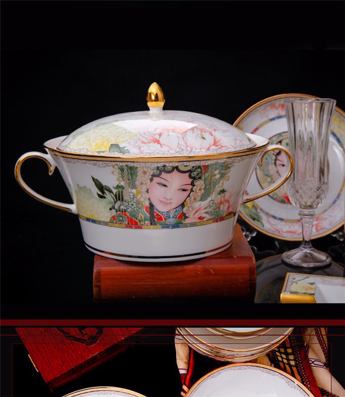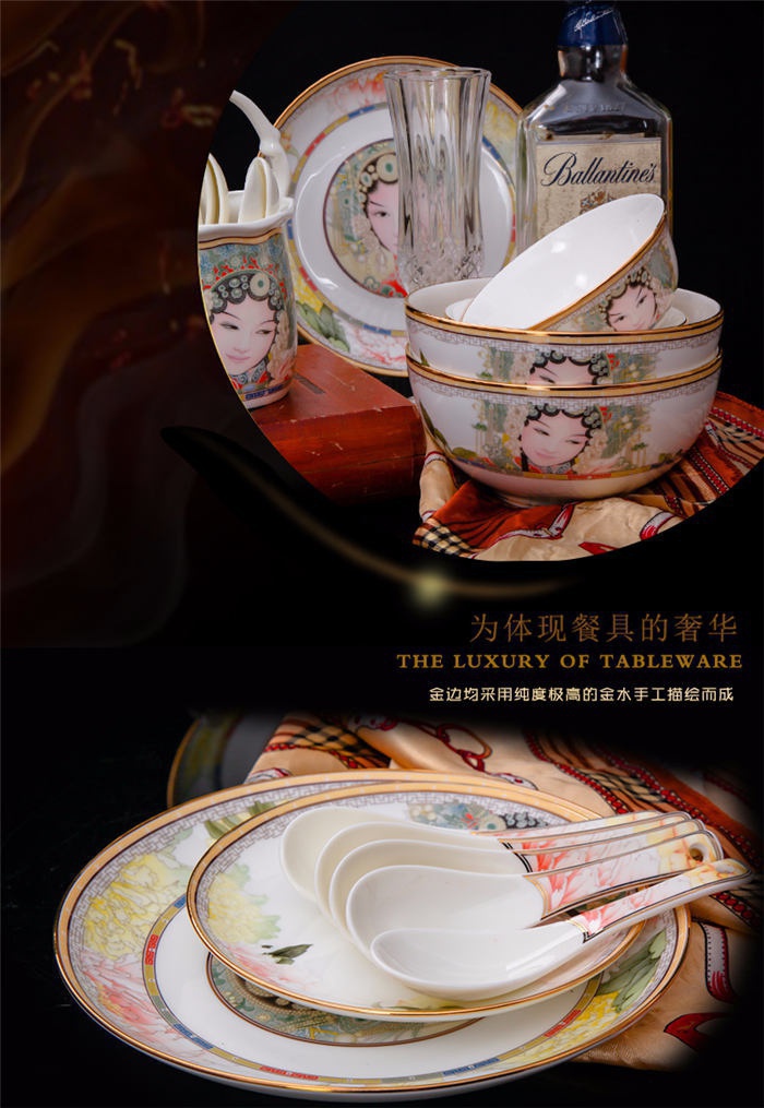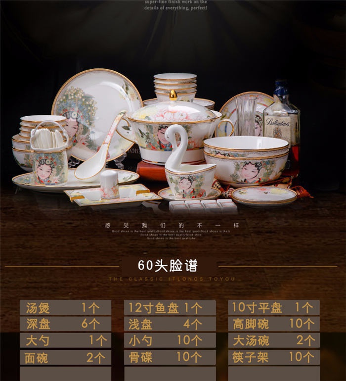 60頭臉譜,一個(gè)湯煲,一個(gè)飯勺,一個(gè)魚(yú)盤(pán),一個(gè)十寸平盤(pán),一個(gè)牙簽筒,一個(gè)煙灰缸,兩個(gè)面碗,兩個(gè)大湯碗,一個(gè)花籃,一個(gè)鳥(niǎo),八塊八寸盤(pán),十個(gè)4.5寸飯碗,十個(gè)骨碟,十個(gè)調(diào)羹,十個(gè)筷子架。