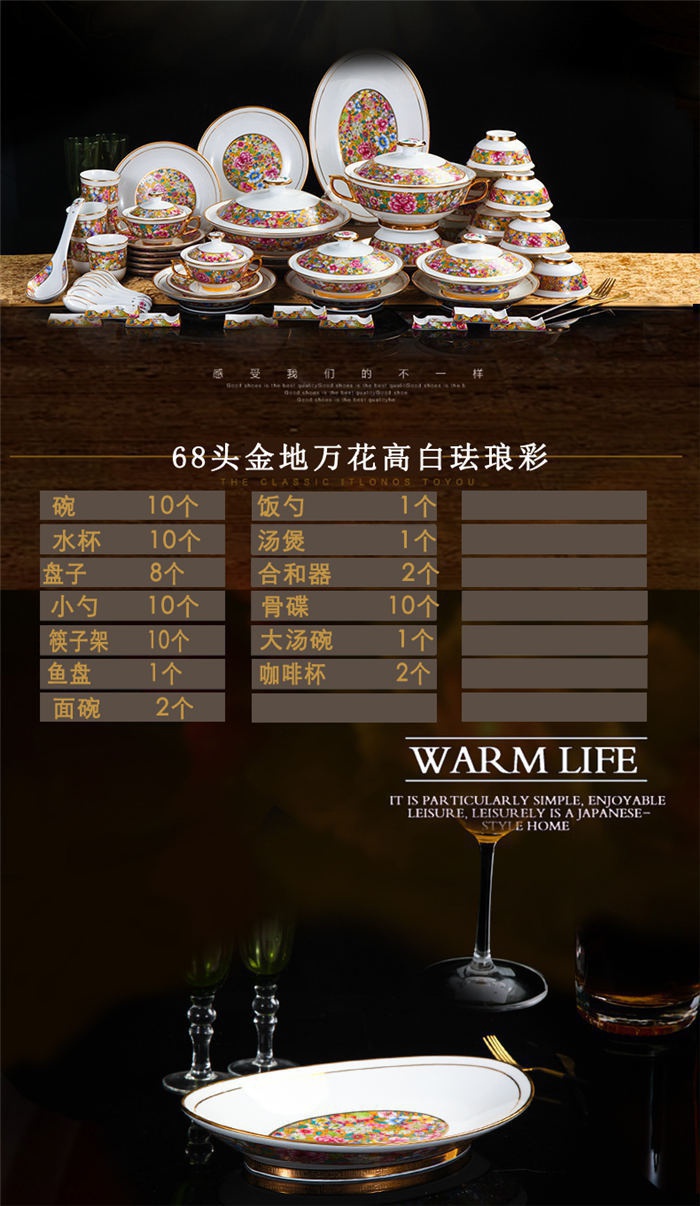 碗十個,水杯十個,盤子八個,小勺十個,筷子架十個,魚盤一個,面碗二個,飯勺一個,湯煲一個,和合器二個,骨碟十個,大湯碗一個,咖啡杯二個。