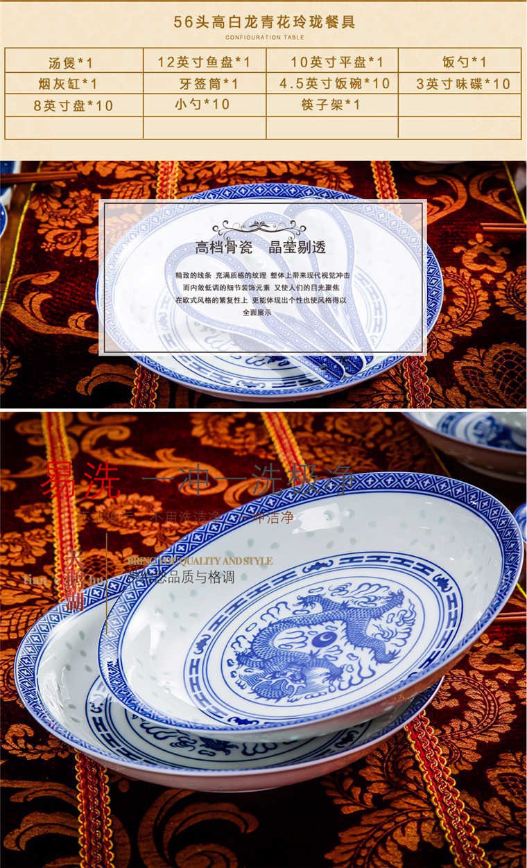 56頭高白龍的青花玲瓏餐具,一個(gè)湯煲,一個(gè)魚盤,一個(gè)十寸圓盤,一個(gè)飯勺,一個(gè)煙缸,一個(gè)牙簽筒,十個(gè)4.5寸飯碗,十個(gè)三寸碟,十個(gè)八寸盤,十個(gè)調(diào)羹,十個(gè)筷子架。56頭高白龍的青花玲瓏餐具,一個(gè)湯煲,一個(gè)魚盤,一個(gè)十寸圓盤,一個(gè)飯勺,一個(gè)煙缸,一個(gè)牙簽筒,十個(gè)4.5寸飯碗,十個(gè)三寸碟,十個(gè)八寸盤,十個(gè)調(diào)羹,十個(gè)筷子架。