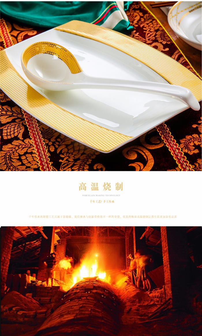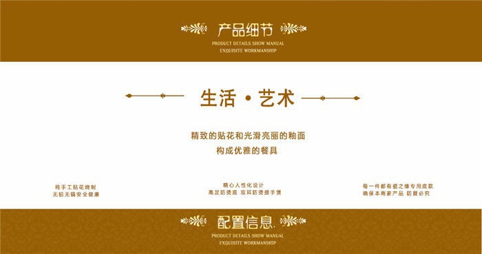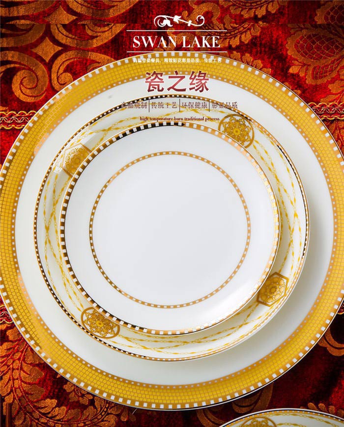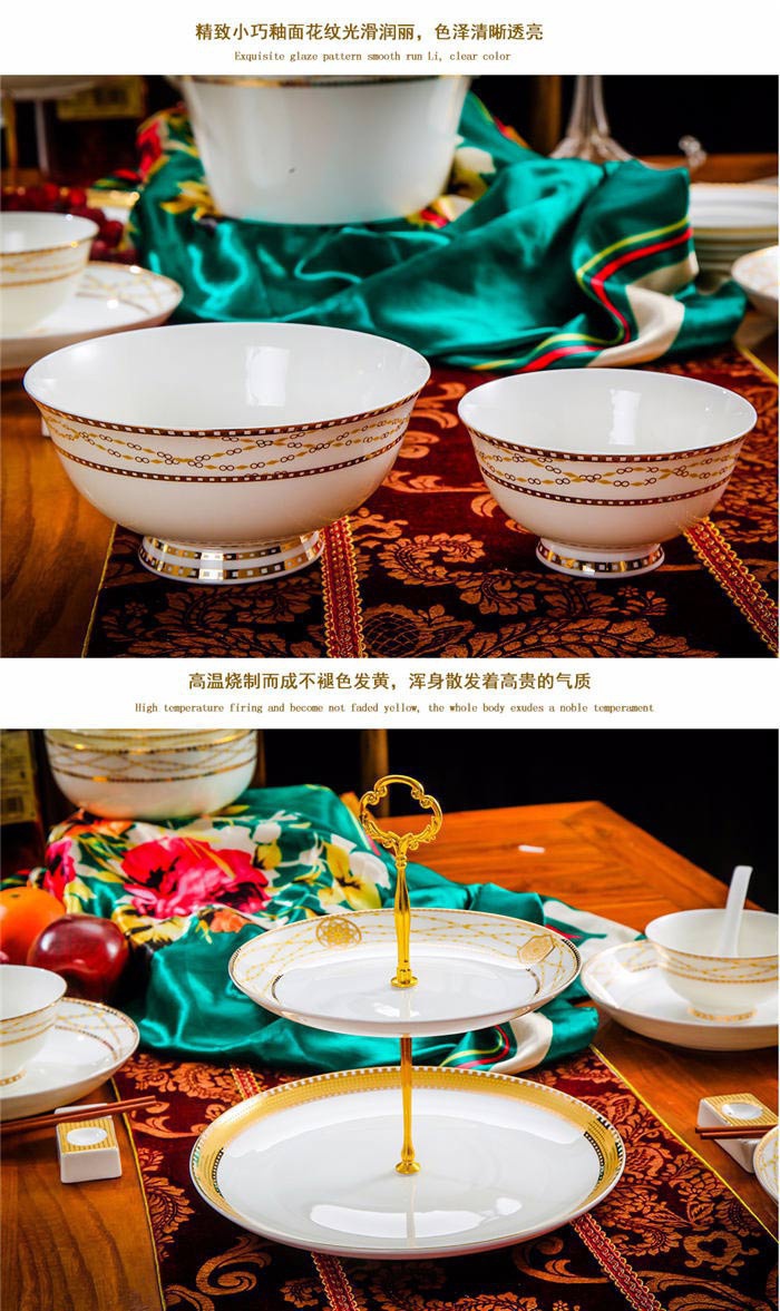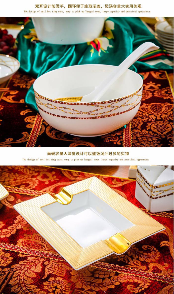 64頭金色港灣,一個湯煲,一個魚盤,一個十寸圓盤,一個飯勺,一個煙灰缸,兩個胡椒瓶,四個面碗,一個雙層水果盤,一個美鵝,十個4.5寸飯碗,十個五寸骨碟,十個八寸盤,十個調(diào)羹,十個筷子架。