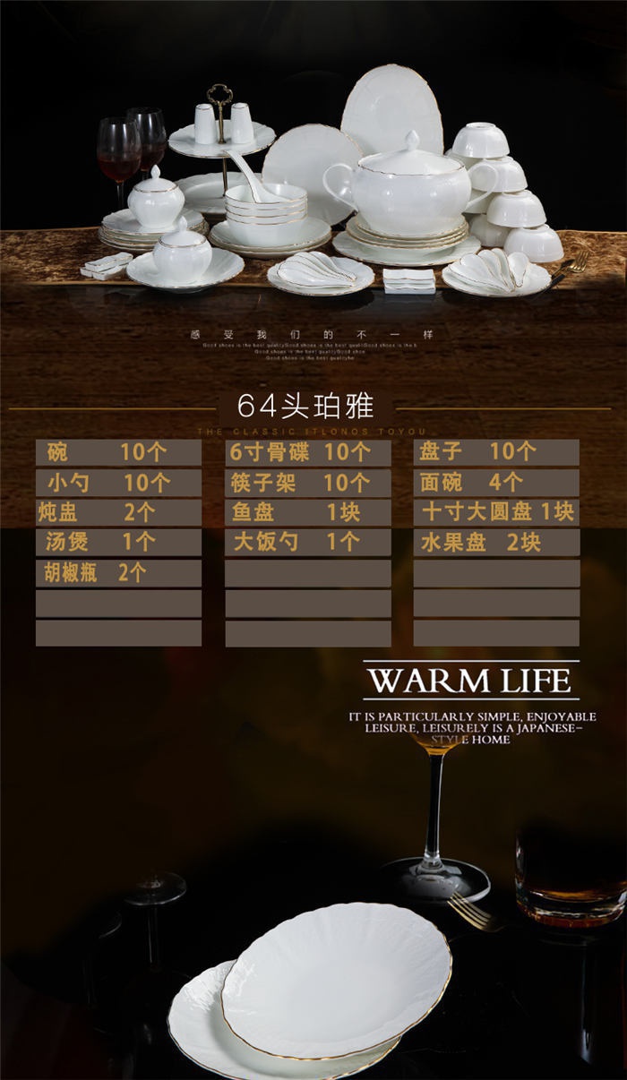 碗十個,6寸骨盤十個,盤子十個,小勺十個,筷子架十個,面碗四個,燉盅二個,魚盤一塊,十寸大圓盤一塊,湯煲一個,大飯勺一個,果盤二塊,胡椒瓶二個。